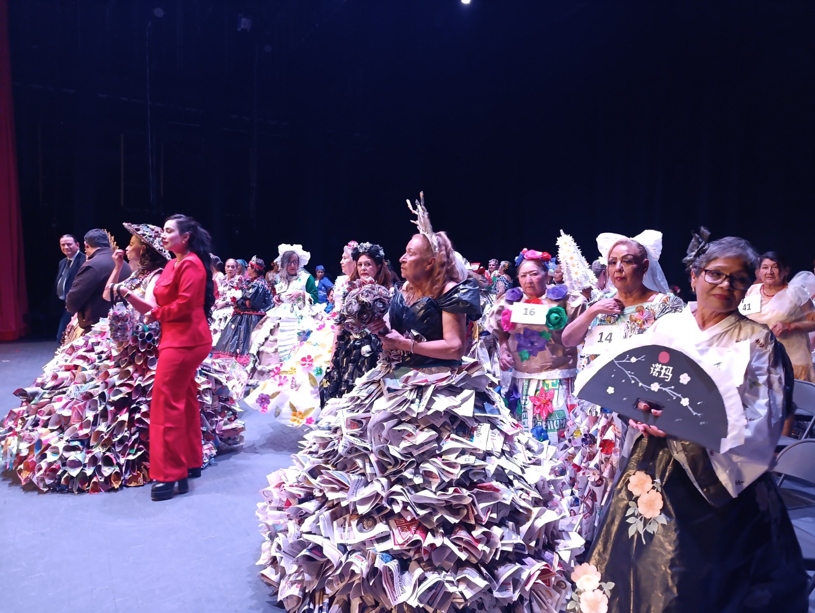 El Teatro de la Ciudad se llenó de aplausos mientras las participantes desfilaron con prendas elaboradas a partir de materiales reciclados. Con paso firme, entusiasmo y un inigualable carisma, las abuelitas modelaron diseños creados con cartón, plástico, papel y otros materiales recuperados, demostrando que el reciclaje también puede convertirse en arte, moda y expresión personal.