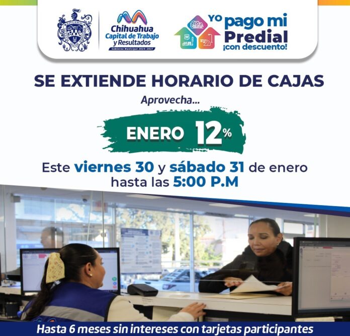 El Gobierno Municipal informa que las cajas de la Tesorería Municipal extenderán su horario hasta las 5:00 de la tarde este viernes 30 y sábado 31, para que las y los capitalinos aprovechen el descuento del 12% en su Predial que se tiene en enero.