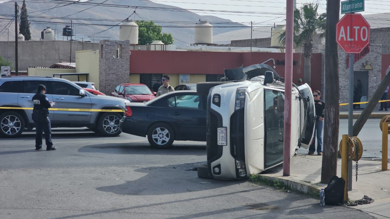 Después del fuerte choque, la camioneta volcó y terminó de costado izquierdo impactando también en un poste de teléfonos de México, el cual quedó inclinado.