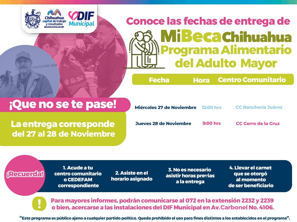 El DIF Municipal informa a las y los beneficiarios del Programa Alimentario del Adulto Mayor (PAAM) los centros comunitarios a los que podrán acudir por su entrega este 27 y 28 de noviembre.
