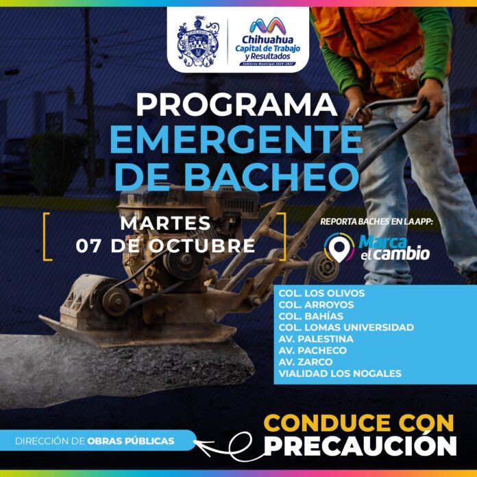 El Gobierno Municipal, a través de la Dirección de Obras Públicas, realizará trabajos de bacheo este 7 de octubre, mediante el programa emergente en calles de las colonias Los Olivos, Arroyos, Bahías, Lomas Universidad, así como en las avenidas Palestina, Pacheco, Zarco y en la Vialidad Los Nogales.