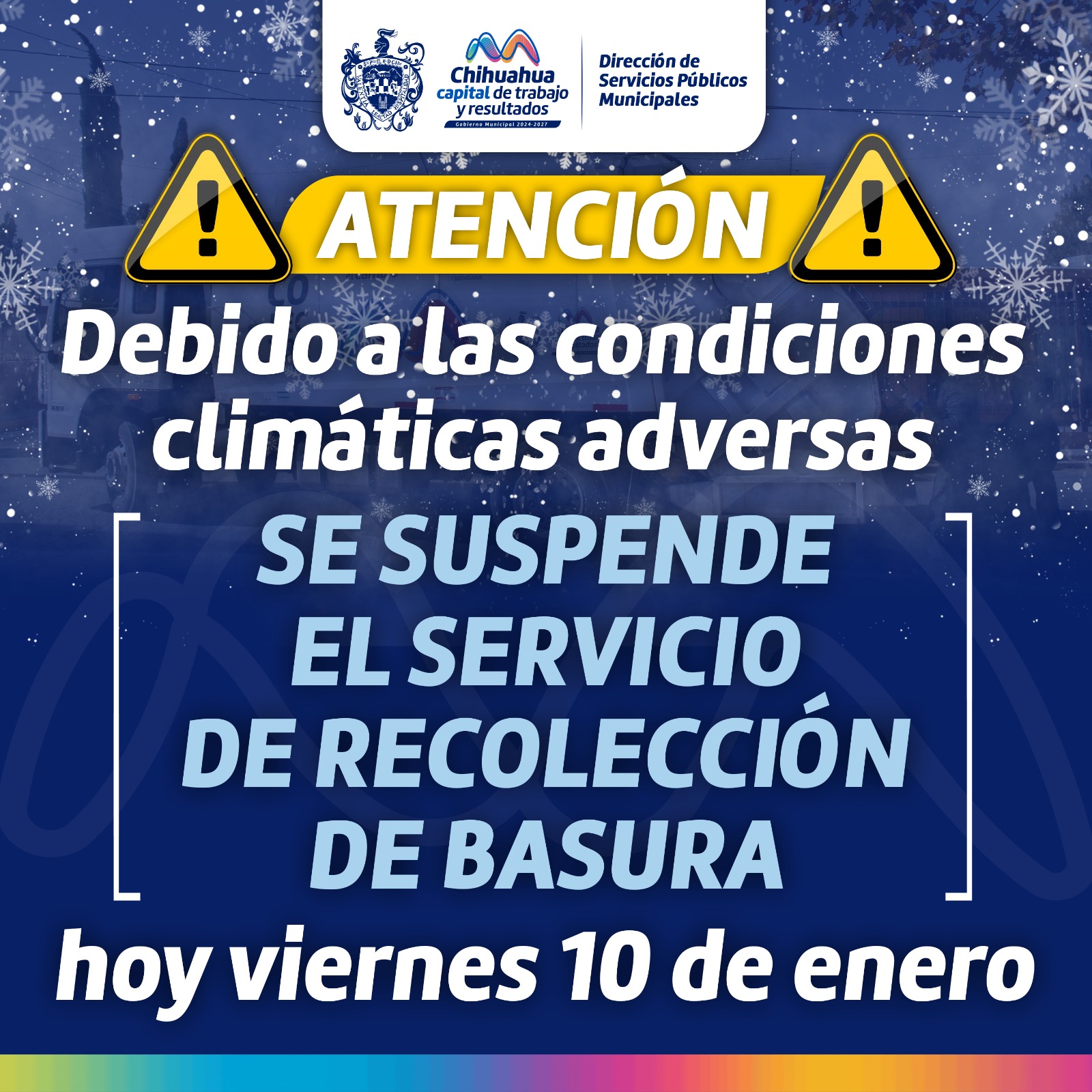 El Gobierno Municipal, a través de la Dirección de Servicios Públicos Municipales, informa a la población en general que el servicio de recolección de residuos se suspenderá este viernes 10 de enero, debido a las inclemencias del tiempo que persisten en la ciudad de Chihuahua.