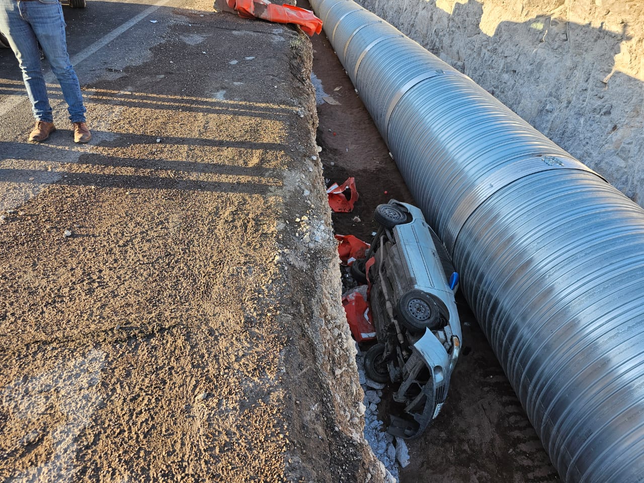 el percance ocurrió en un punto vial en el que se estaban realizando trabajos de instalación de una tubería a un costado de la carretera en mención, en donde la persona al parecer no observó los trabajos y cayó al interior, quedándo de costado el vehículo.
