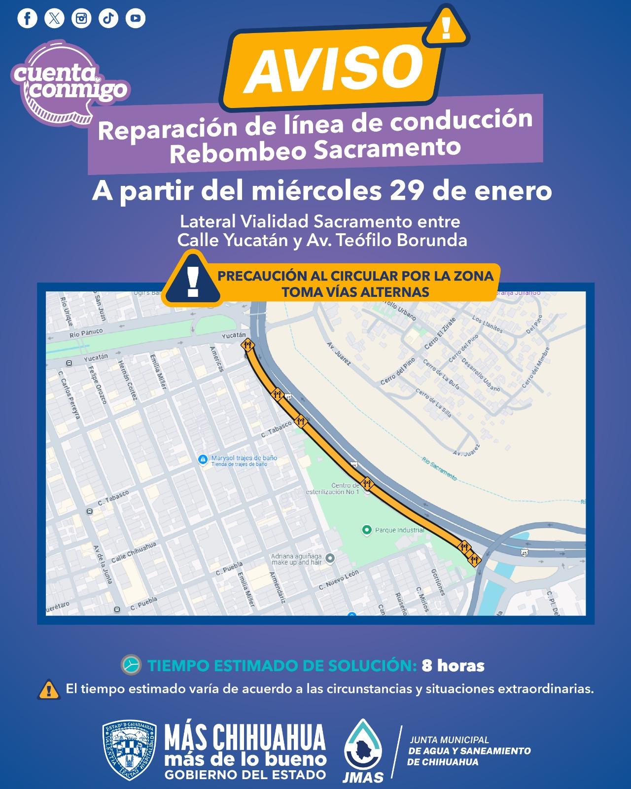 Como parte de estas labores, se cerrará temporalmente el carril lateral de la vialidad Sacramento, en sentido norte-sur, a la altura de la avenida Teófilo Borunda durante un aproximado de ocho horas, tiempo estimado para finalizar las reparaciones.