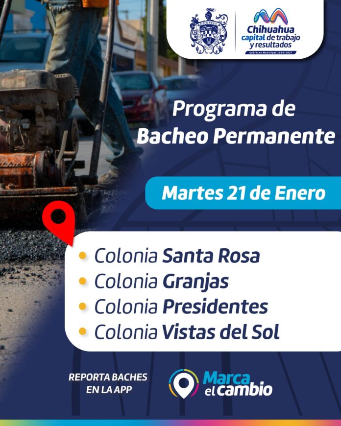 El Gobierno Municipal, intervendrá con bacheo este 21 de enero en calles de las colonias Santa Rosa, Granjas, Presidentes y Vistas del Sol.