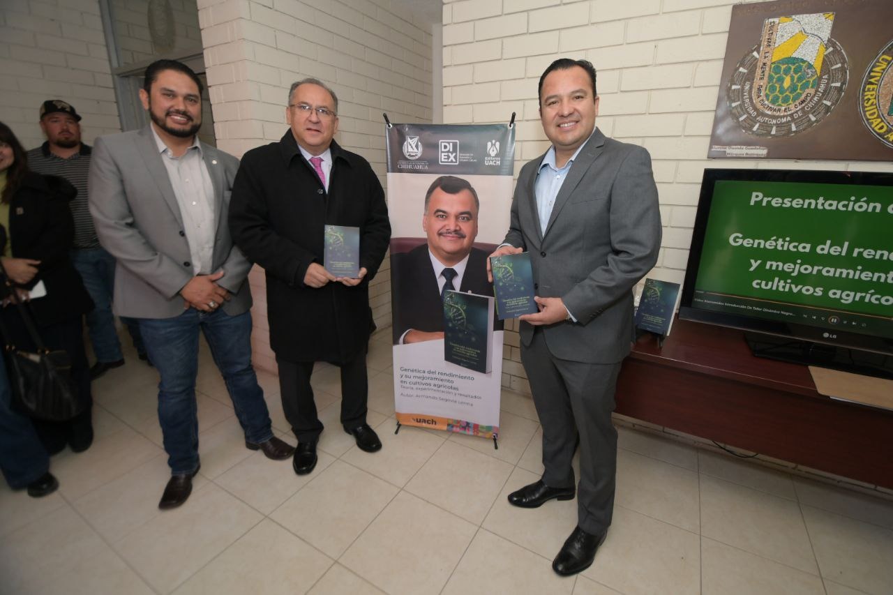 El maestro Luis Alfonso Rivera Campos, rector de la Universidad Autónoma de Chihuahua, encabezó la ceremonia de clausura de las actividades realizadas en el marco del 45.° Aniversario del Posgrado, con la presentación del libro «Genética del rendimiento y su mejoramiento en cultivos agrícolas. Teoría, experimentación y resultados», de la autoría del Dr. Armando Segovia Lerma.