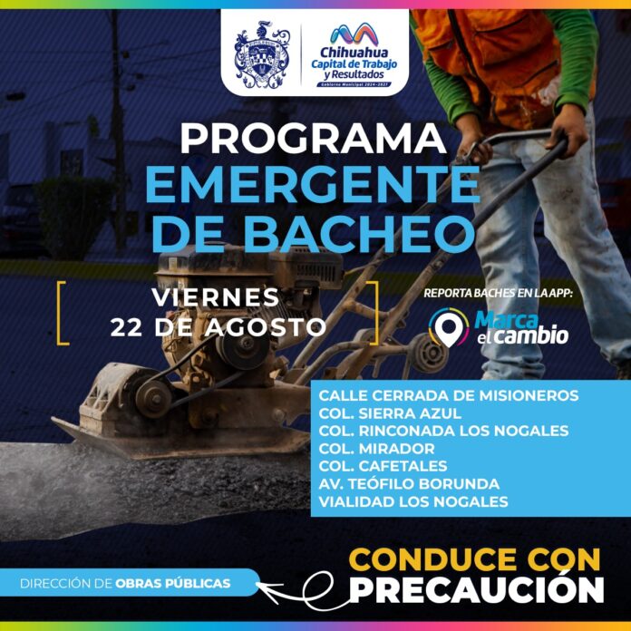 El Gobierno Municipal, a través de la Dirección de Obras Públicas, atenderá baches este 22 de agosto mediante el programa emergente en la calle Cerrada de Misioneros, colonias Sierra Azul, Rinconada Los Nogales, Mirador y Cafetales, así como en la avenida Teófilo Borunda y la vialidad Los Nogales.