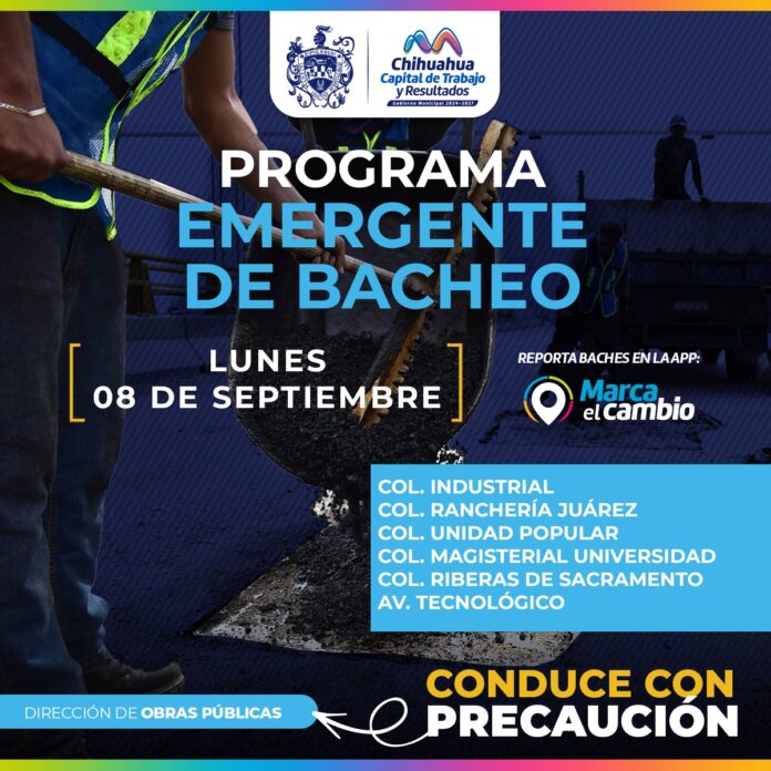El Gobierno Municipal, a través de la Dirección de Obras Públicas, realizará trabajos de bacheo este 8 de septiembre, mediante el programa emergente, en las colonias Industrial, Ranchería Juárez, Unidad Popular, Magisterial Universidad y Riberas de Sacramento, así como en la avenida Tecnológico.