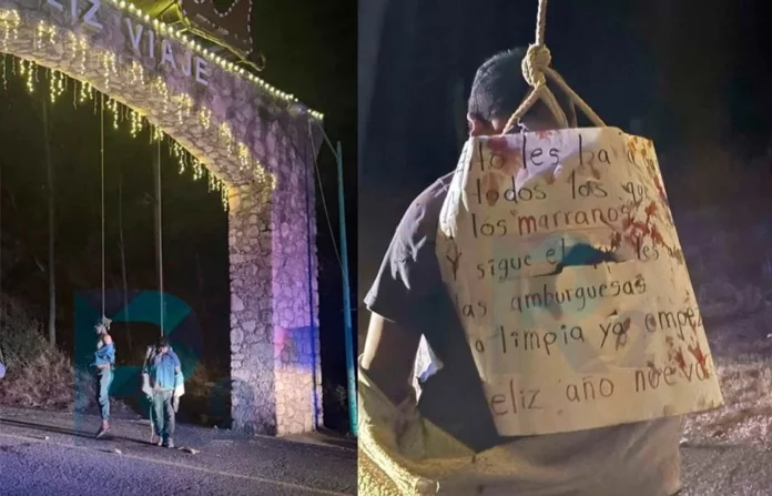 Con un mensaje de año nuevo, un grupo delictivo que opera en la región del municipio de Guadalupe y Calvo colgó tres cadáveres en el arco con las letras de entrada a la cabecera municipal en mención.