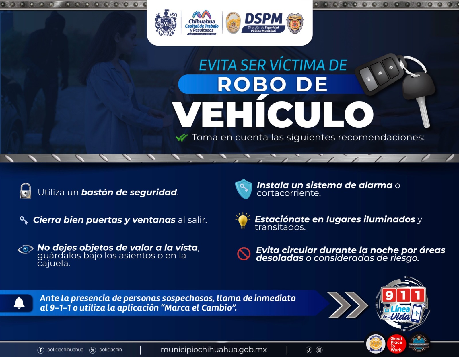 Con la finalidad de proteger el patrimonio de las familias chihuahuenses, el Gobierno Municipal, a través de la Dirección de Seguridad Pública Municipal (DSPM), exhorta a reforzar las medidas de prevención y emite recomendaciones para evitar robos o daños en sus vehículos.