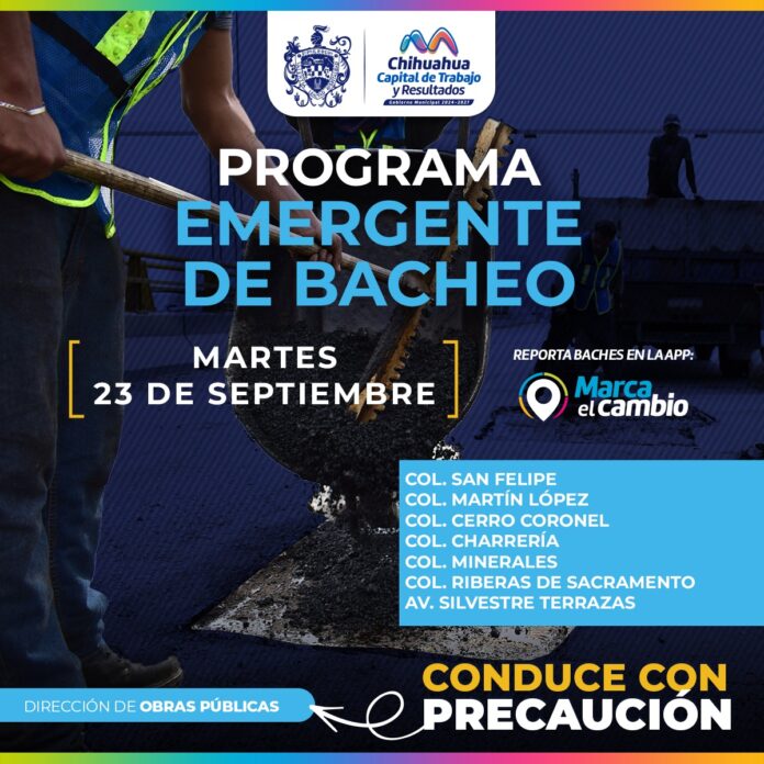 El Gobierno Municipal, a través de la Dirección de Obras Públicas, realizará trabajos de bacheo, este 23 de septiembre, mediante el programa emergente en calles de las colonias San Felipe, Martín López, Cerro Coronel, Charrería, Minerales, Riberas del Sacramento y en la avenida Silvestre Terrazas.