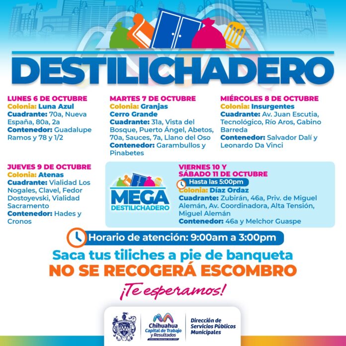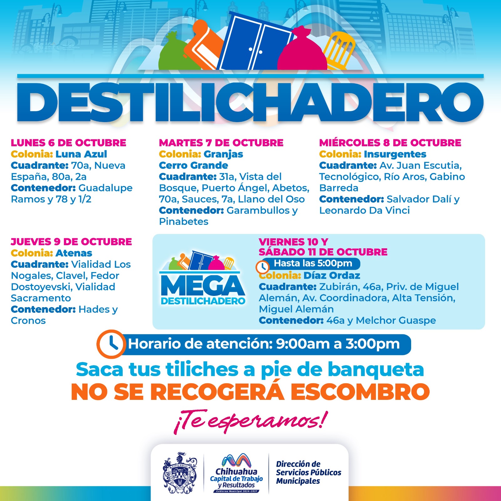Para evitar acumulaciones de basura de grandes dimensiones en las viviendas, que podría generar plagas o problemas de salud, el Gobierno Municipal, a través de la Dirección de Servicios Públicos Municipales, informa el calendario del programa Destilichadero, que se realizará 6 al 11 de octubre en cinco colonias de la Capital.