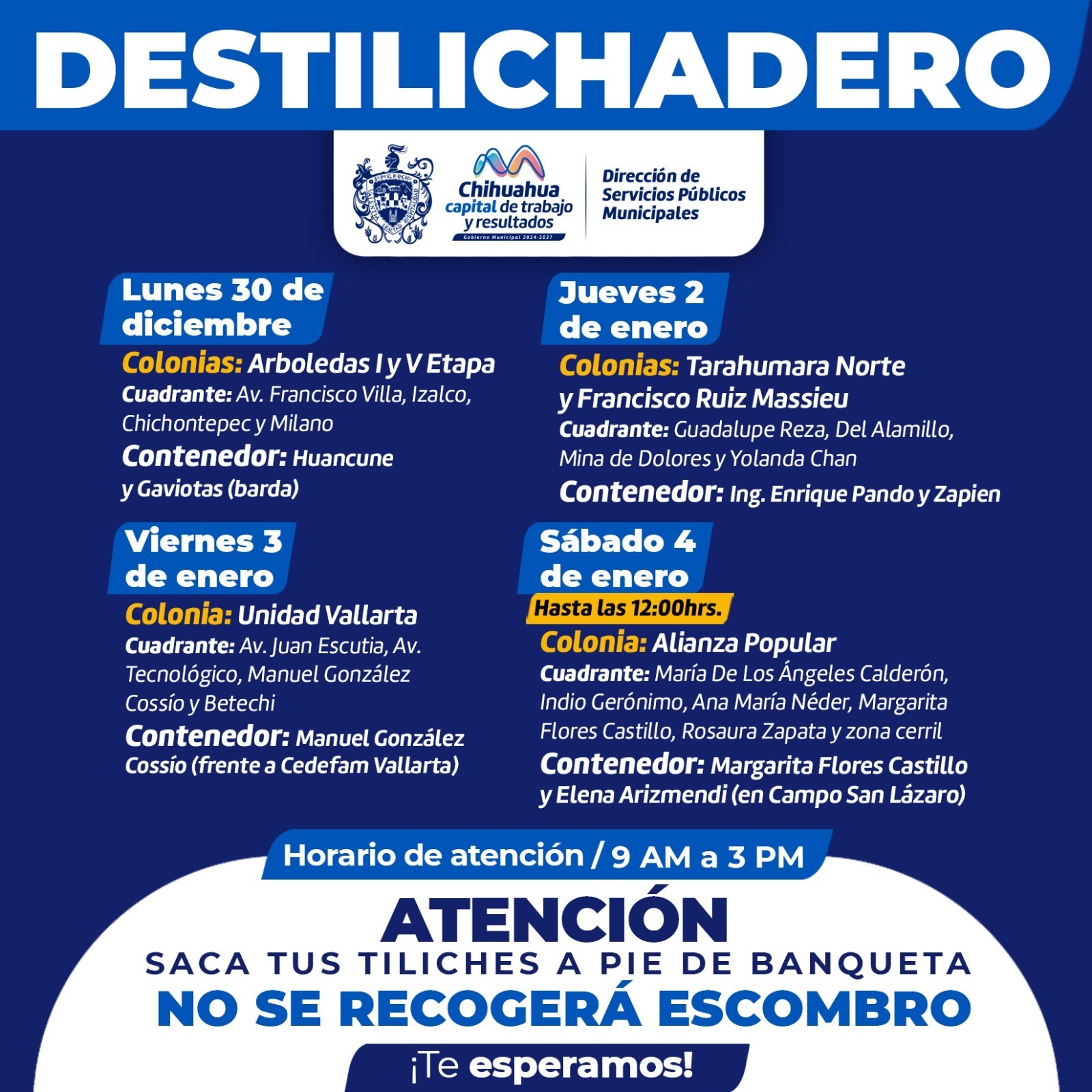 Para evitar acumulaciones de basura de grandes dimensiones en las viviendas, que podría generar plagas o problemas de salud, el Gobierno Municipal, a través de la Dirección de Servicios Públicos Municipales, informa el calendario del programa Destilichadero, que se realizará del 30 de diciembre al 4 de enero en seis colonias de la Capital.