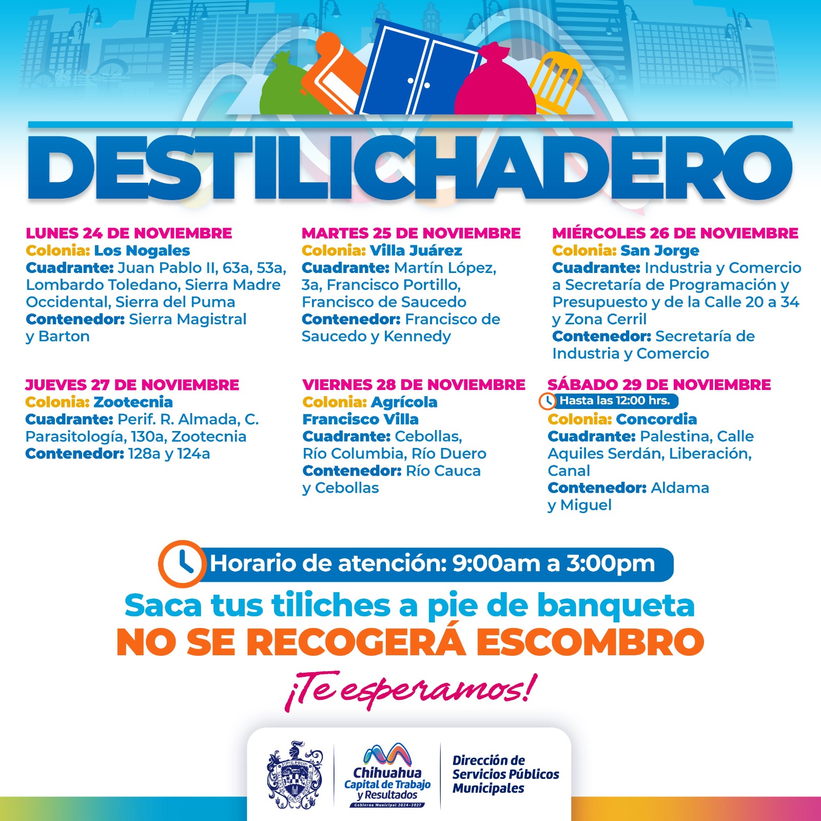 Para evitar acumulaciones de basura de grandes dimensiones en las viviendas, que podría generar plagas o problemas de salud, el Gobierno Municipal, a través de la Dirección de Servicios Públicos Municipales, informa el calendario del programa Destilichadero, que se realizará en seis de colonias de la Capital del 24 al 29 de noviembre.