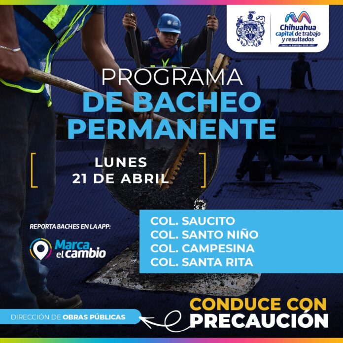 El Gobierno Municipal, por medio de la Dirección de Obras Públicas, informa que este viernes se tendrán labores de bacheo en las colonias Saucito, Santo niño, Campesina y Santa Rita