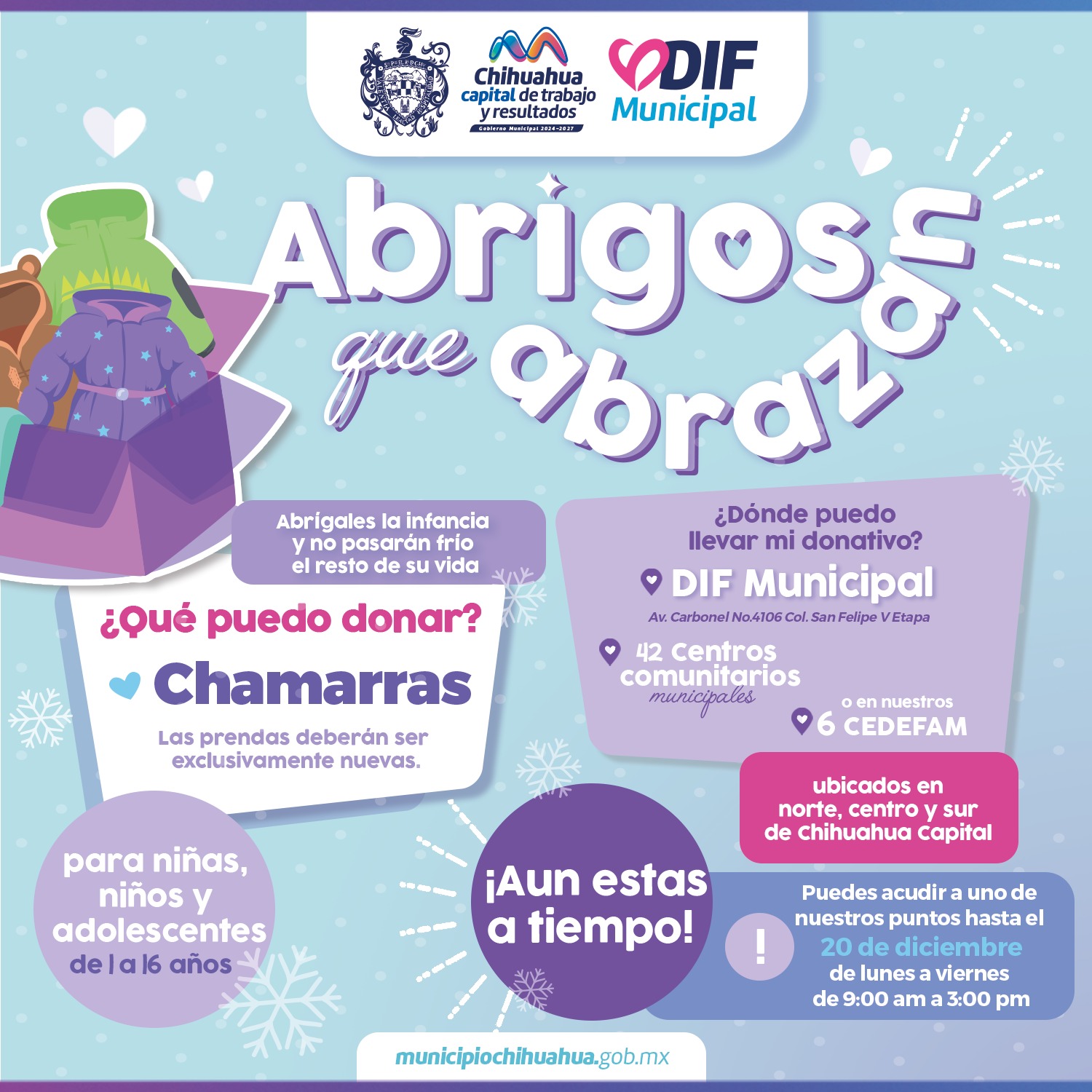 El Gobierno Municipal de Chihuahua, a través del DIF, anuncia que la recepción de la campaña invernal “Abrigos que Abrazan”, se extenderá hasta el próximo 20 de diciembre.
