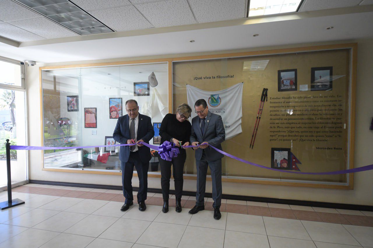 En el vestíbulo de la Facultad de Filosofía y Letras, el Rector de la UACH, Mtro. Luis Alfonso Rivera Campos, encabezó la inauguración de la exposición «¡Que viva la Filosofía!», la cual destaca la travesía y logros de la alumna Mercedes Reza.