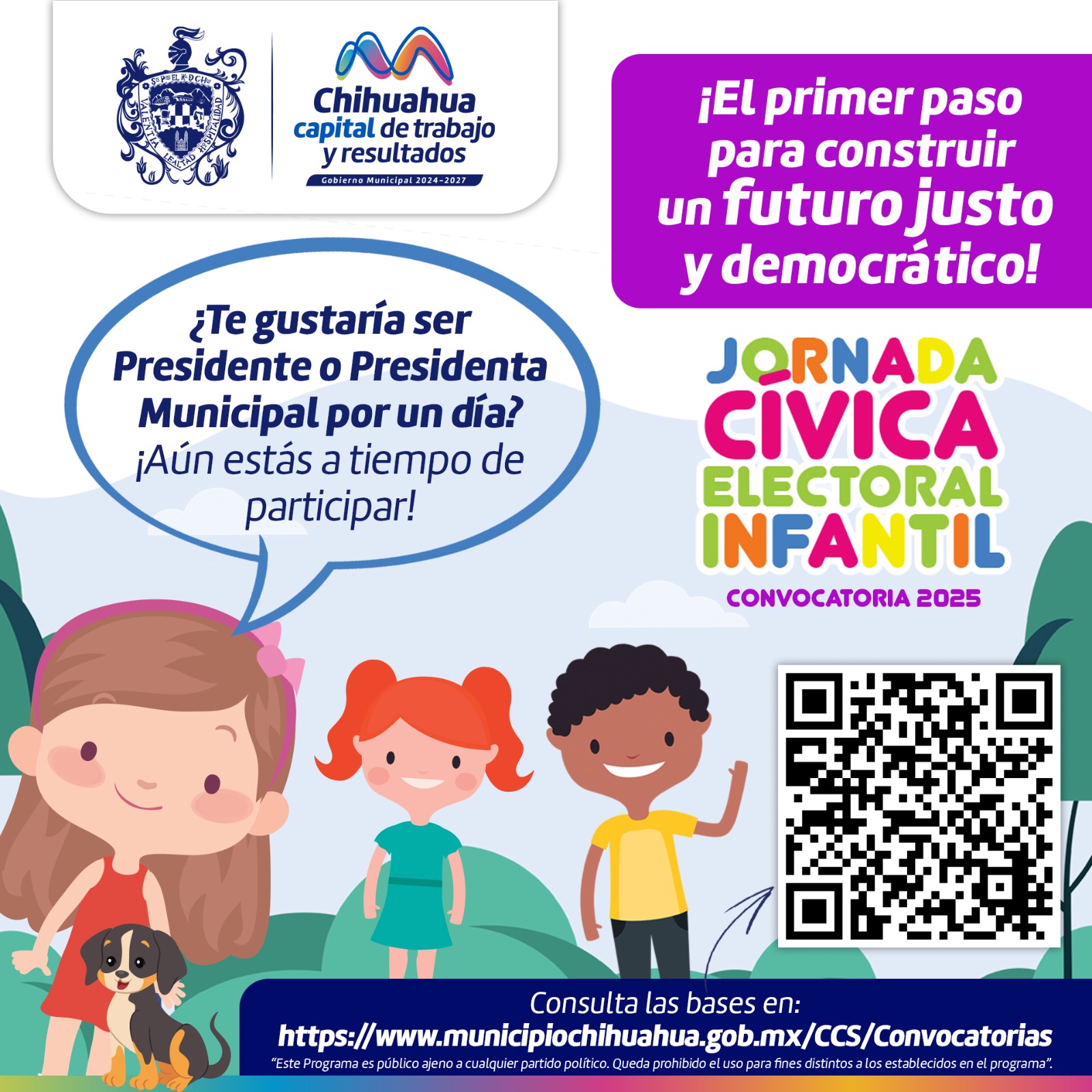 El Gobierno Municipal, a través de la Dirección de Desarrollo Humano y Educación, en colaboración con el Instituto Estatal Electoral, invitan a alumnas y alumnos que cursan el sexto grado de primaria en escuelas públicas y privadas a la Jornada Cívica Electoral Infantil 2025 para elegir a las niñas o niños titulares de la Presidencia Municipal, Sindicatura, Secretaría del H. Ayuntamiento, Regidores y Gabinete Municipal, que conformarán el Decimocuarto Consejo Infantil del Municipio de Chihuahua por el Día de la Niñez.