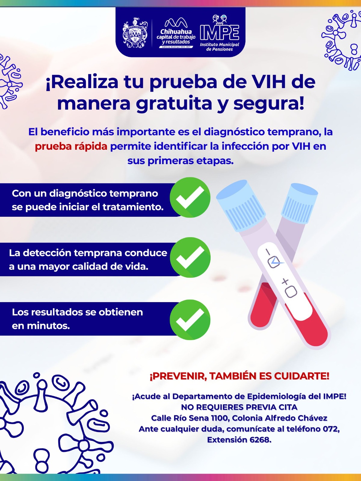 El Gobierno Municipal, por medio del Instituto Municipal de Pensiones (IMPE), invita a la ciudadanía en general y a derechohabientes, a realizarse la prueba rápida, para detectar oportunamente el Virus de la Inmunodeficiencia Humana (VIH), la cual se realiza de manera gratuita y segura.