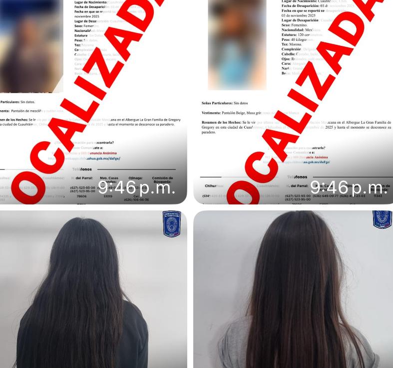 Derivado de la pronta activación del Protocolo Alba y las investigaciones de búsqueda se localizó a las menores de iniciales, J.I.C.C y A.D.M.C. de 13 y 11 años de edad respectivamente, en la colonia Tierra Nueva de la ciudad de Cuauhtémoc