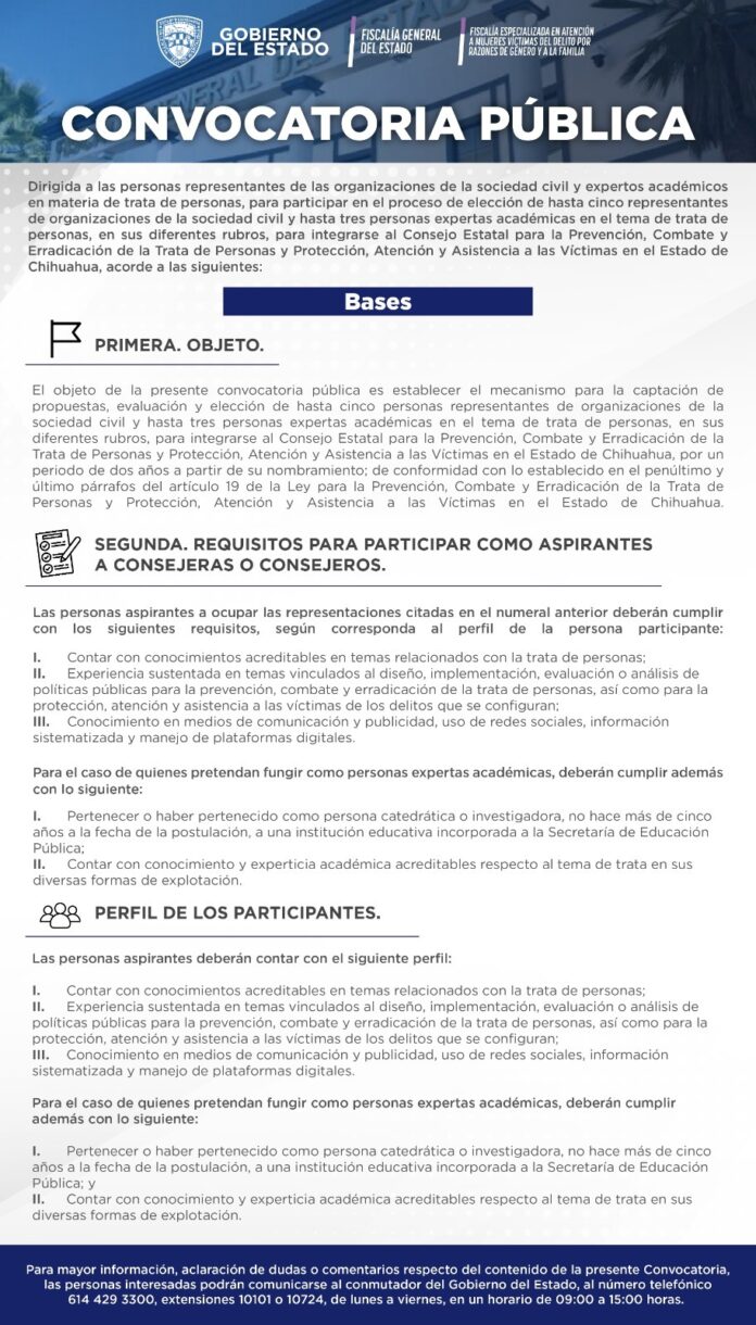 En seguimiento a la integración del Consejo Estatal para la Prevención, Combate y Erradicación de la Trata de Personas y Protección, Atención y Asistencia a las Víctimas en el Estado de Chihuahua, la Fiscalía General del Estado a través de la Fiscalía Especializada en Atención a Mujeres Víctimas del Delito por Razones de Género y a la Familia, mantiene vigente la convocatoria pública.