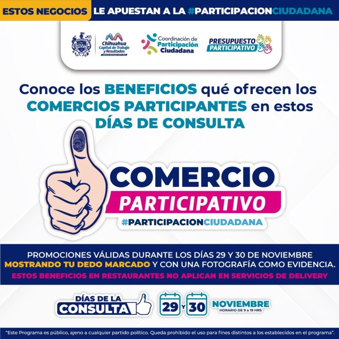 El Gobierno Municipal informa que 26 comercios locales se sumaron a la consulta del Presupuesto Participativo 2026, para ofrecer descuentos y beneficios a quienes participen en la jornada de votación este 29 y 30 de noviembre, ya sea en urnas o a través de la aplicación móvil.