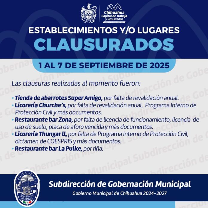 El Gobierno Municipal de Chihuahua, a través de la Subdirección de Gobernación de la Secretaría del Ayuntamiento, informa que del 1 al 7 de septiembre se realizaron 281 inspecciones a locales y establecimientos, resultando en 17 actas administrativas por diversos motivos y cuatro clausuras en total.