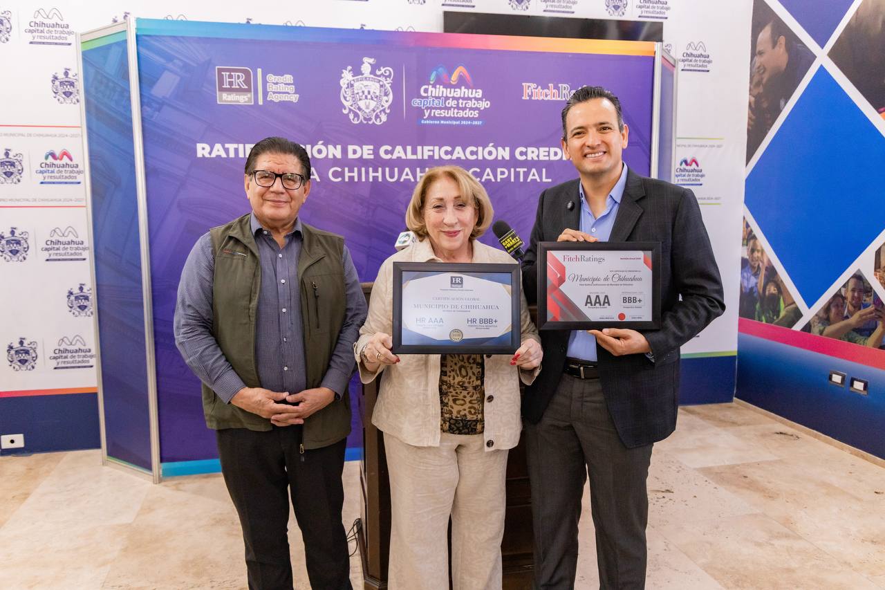 El alcalde de Chihuahua, Marco Bonilla Mendoza recibió los resultados que otorgaron las calificadoras crediticias Fitch Ratings y HR Ratings por parte de la tesorera, Amanda Córdova, quien le informó que se ratificó al Municipio de Chihuahua a nivel nacional con AAA, por tener finanzas sanas, sólidas y estables.