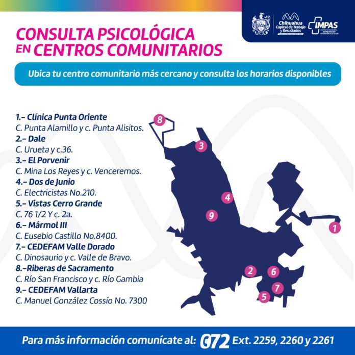 El Gobierno Municipal de Chihuahua, a través del Instituto Municipal de Prevención y Atención a la Salud (IMPAS), invita a las y los chihuahuenses a hacer uso del servicio de consulta psicológica, a la cual se puede acceder en instalaciones ubicadas en varios puntos de la capital.