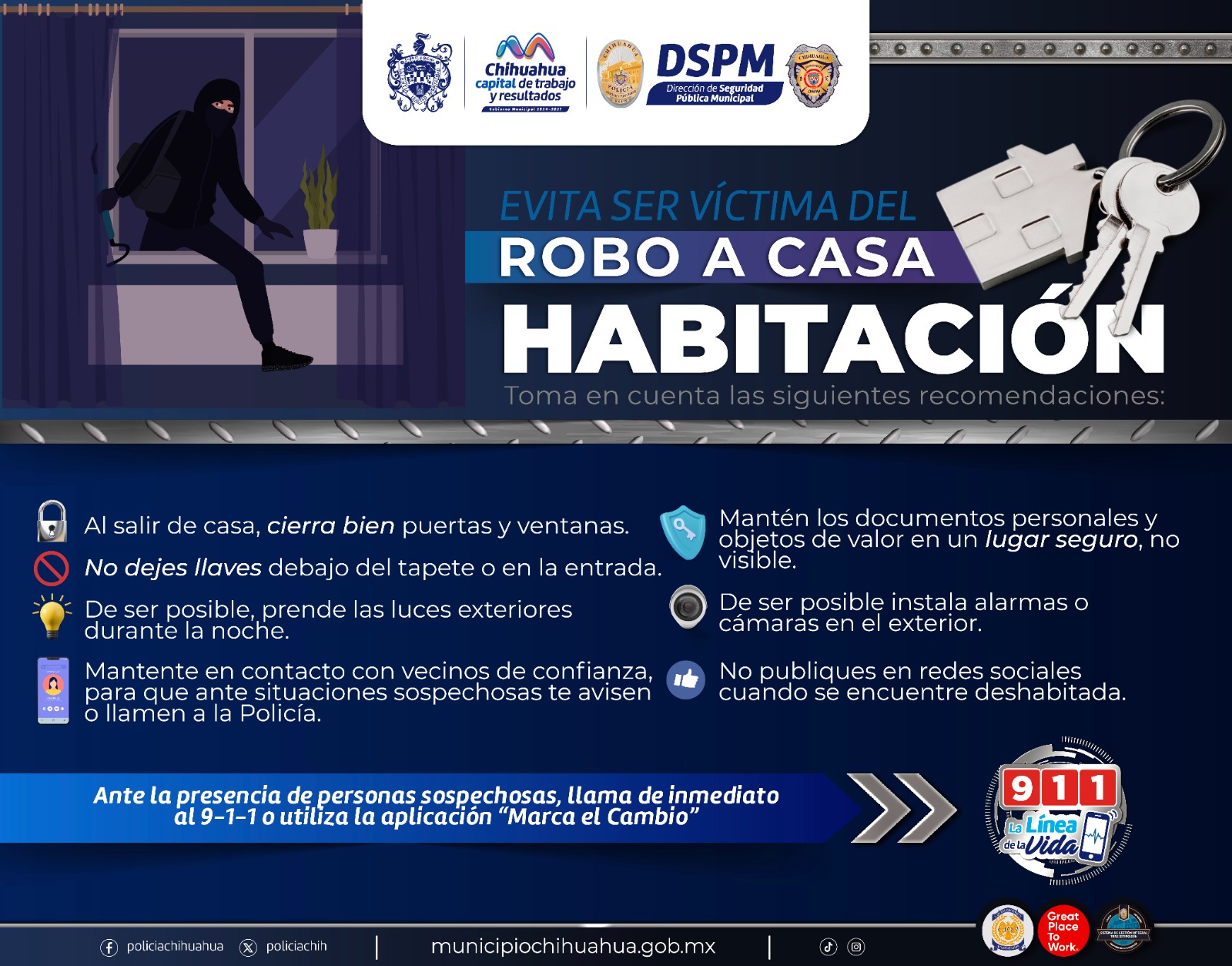 Con el objetivo de prevenir robos en el hogar, el Gobierno Municipal a través de la Dirección de Seguridad Pública, exhorta a las y los chihuahuenses a seguir las siguientes medidas que serán de gran utilidad.