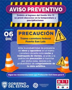 Estas condiciones podrían estar además acompañadas de aguanieve durante la madrugada del viernes en la carretera Janos-Agua Prieta.