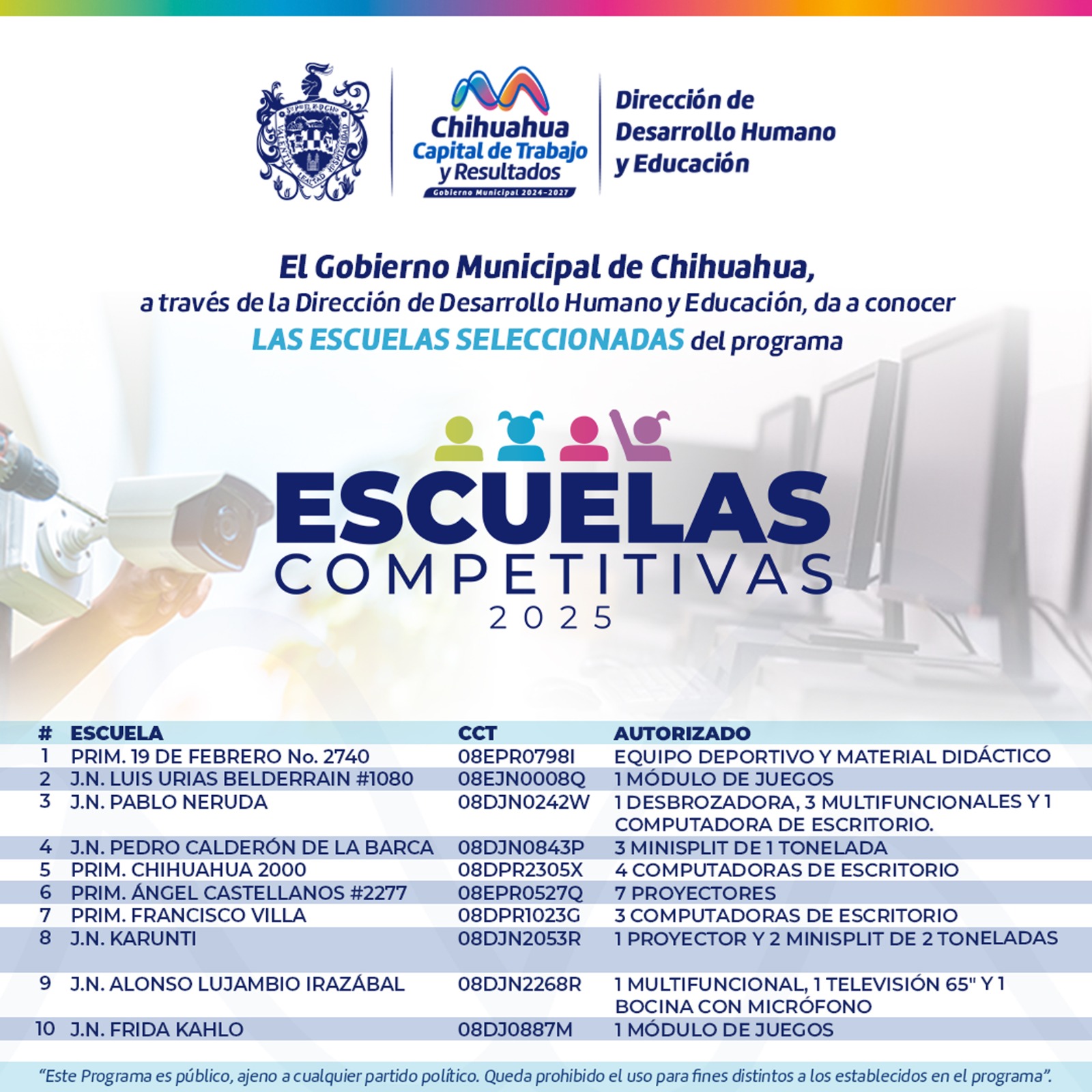 El Gobierno Municipal, a través de la Dirección de Desarrollo Humano y Educación, publicó la lista de escuelas aceptadas en el programa “Escuelas Competitivas 2025”.