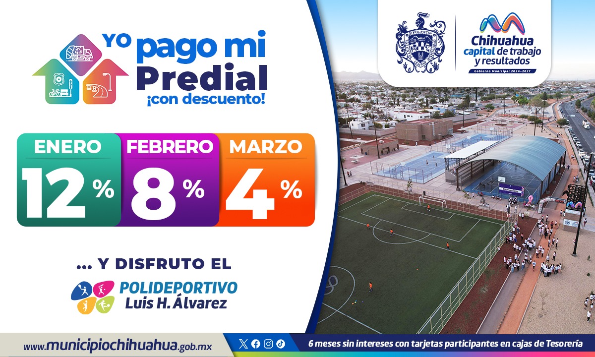 El Gobierno Municipal, a través de Tesorería, invita a aprovechar el 12 por ciento de descuento en el Impuesto Predial que estará vigente a partir del 2 de enero, para personas físicas y morales.