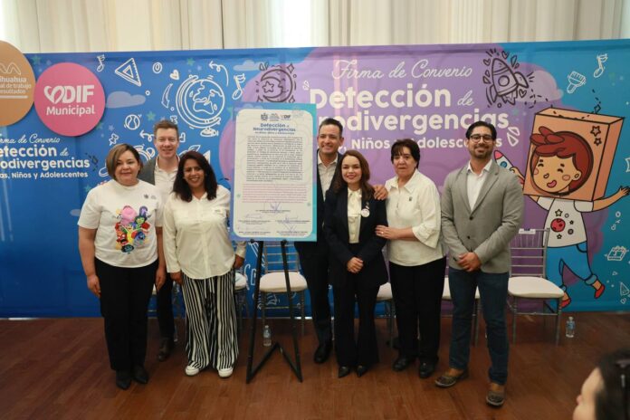 El alcalde Marco Bonilla, la presidenta del DIF Municipal, Karina Olivas, la Secretaría del Ayuntamiento, el Instituto Municipal de Prevención y Atención a la Salud, así como los regidores del Ayuntamiento representados por la titular de la comisión de Salud, firmaron un convenio de colaboración para seguir apoyando a niñas y niños con neurodivergencias.