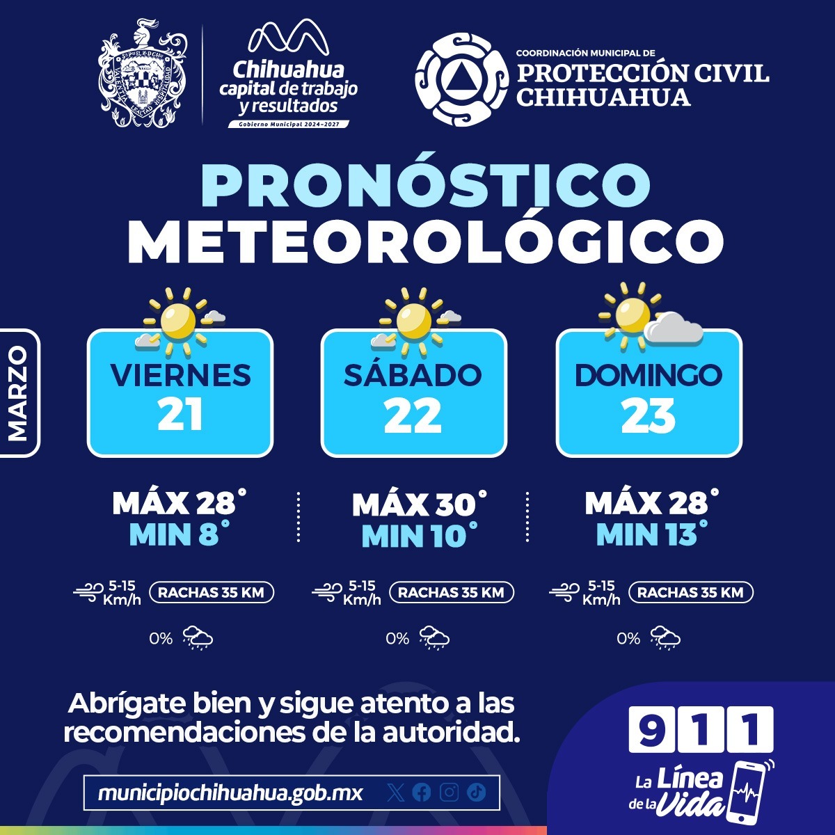 La Coordinación Municipal de Protección Civil, informa que este fin de semana, del 21 al 23 de marzo, se prevén temperaturas máximas de 30°C y mínimas de 8°C.
