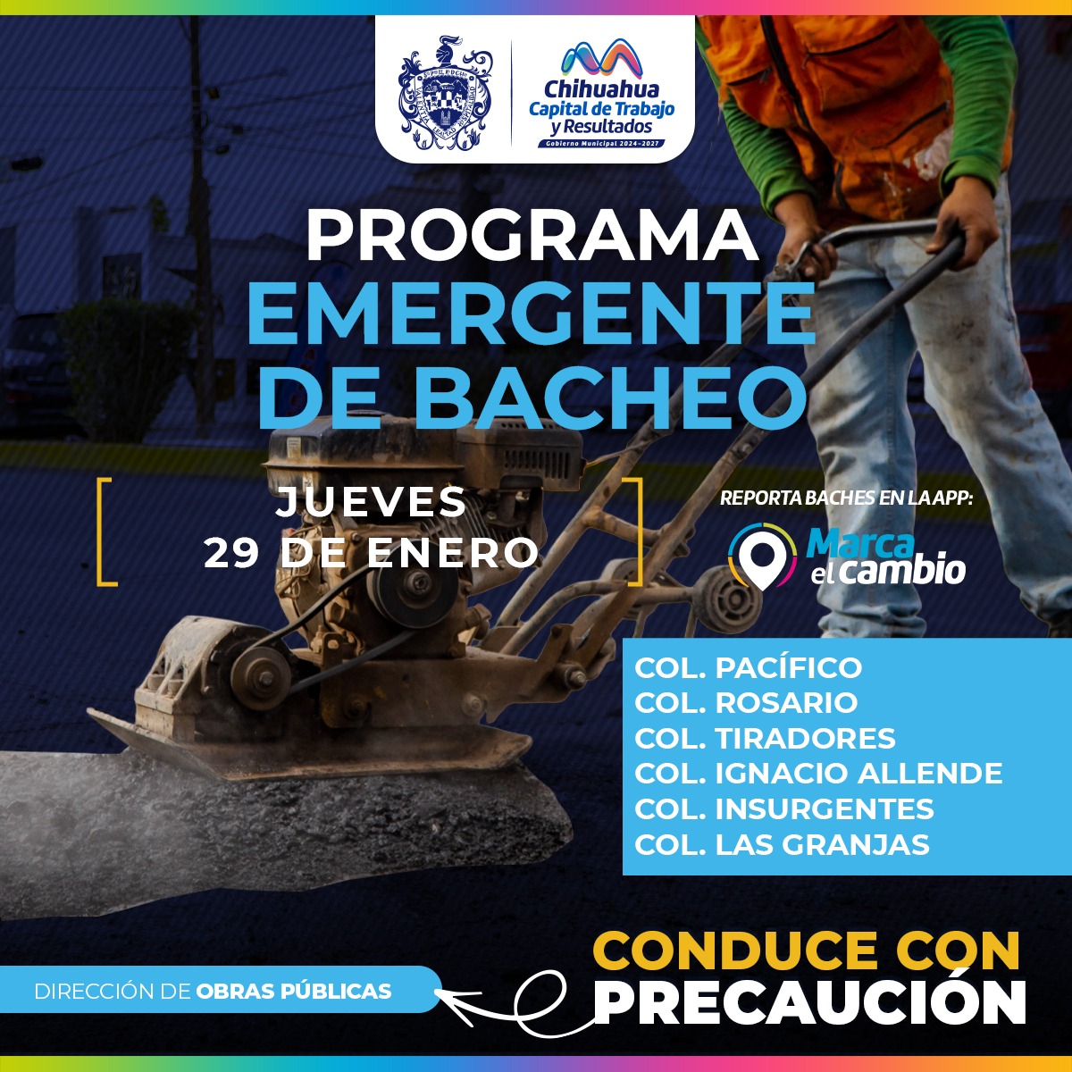 El Gobierno Municipal, a través de la Dirección de Obras Públicas, realizará trabajos de bacheo este jueves 29 de enero mediante el programa emergente en calles de las colonias: Pacífico, Rosario, Tiradores, Ignacio Allende, Insurgentes y Las Granjas.