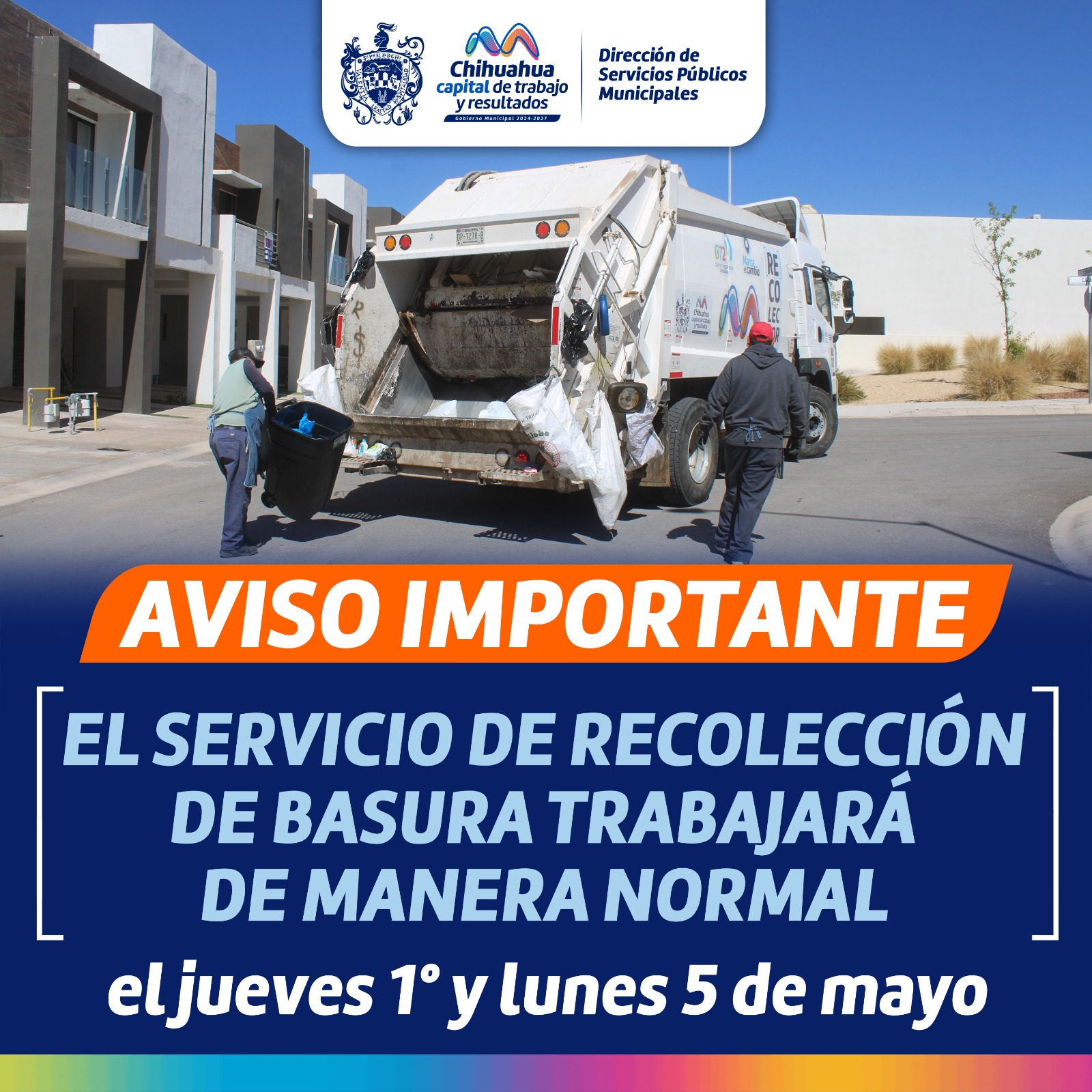 El Gobierno Municipal, a través de la Dirección de Servicios Públicos Municipales, informa a la ciudadanía en general que el próximo jueves 1 y lunes 5 de mayo el servicio de recolección de basura habitacional se realizará de manera regular.