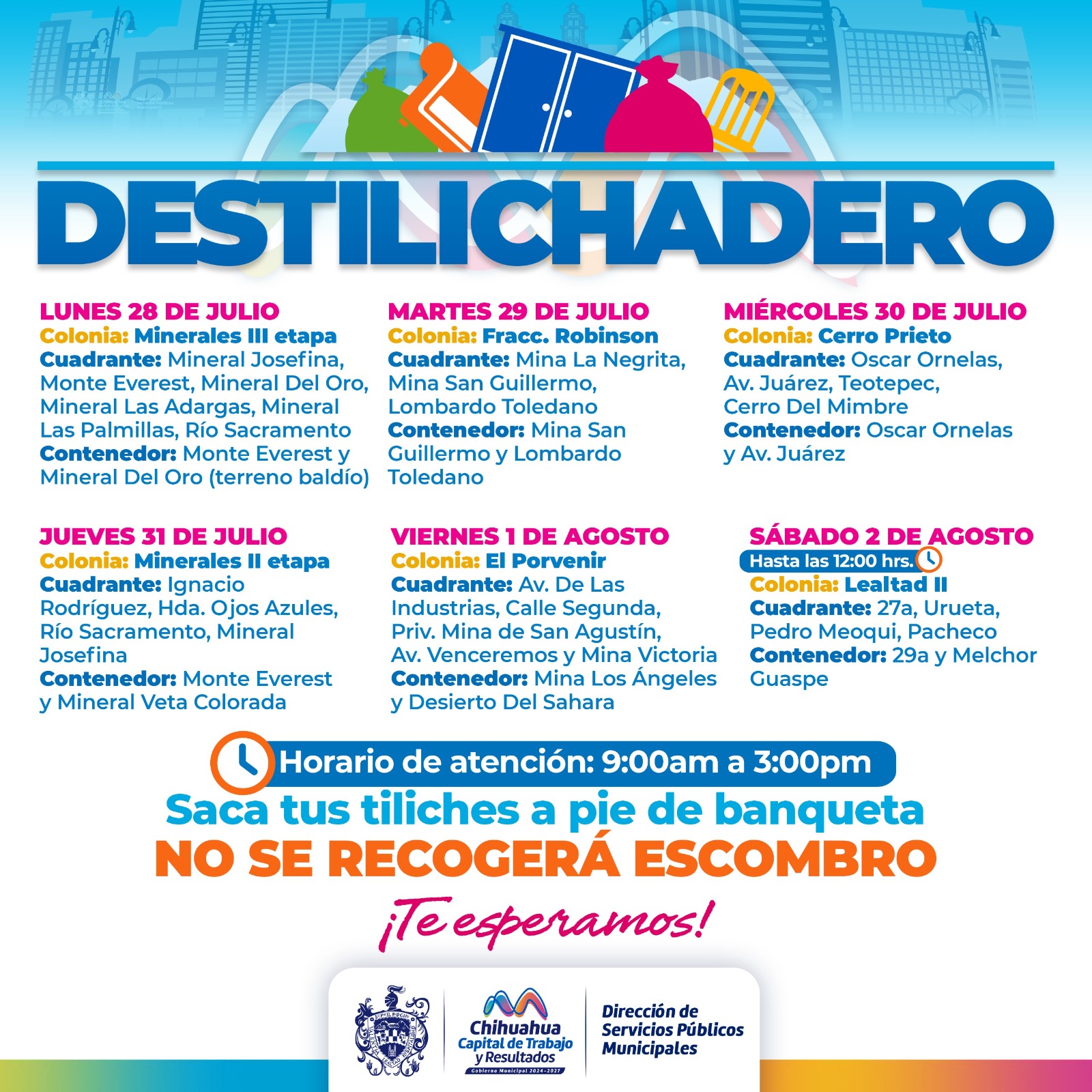 Para evitar acumulaciones de basura de grandes dimensiones en las viviendas, que podría generar plagas o problemas de salud, el Gobierno Municipal, a través de la Dirección de Servicios Públicos Municipales, informa el calendario del programa Destilichadero, que se realizará del 28 de julio al 2 de agosto en seis colonias de la Capital.